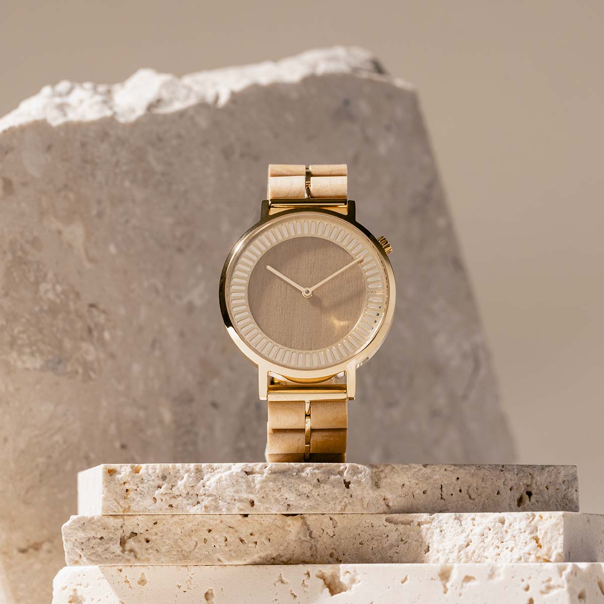 In the A40 watch, the gold-toned case and the bezel structure with circular holes are combined with harmonious birch wood.