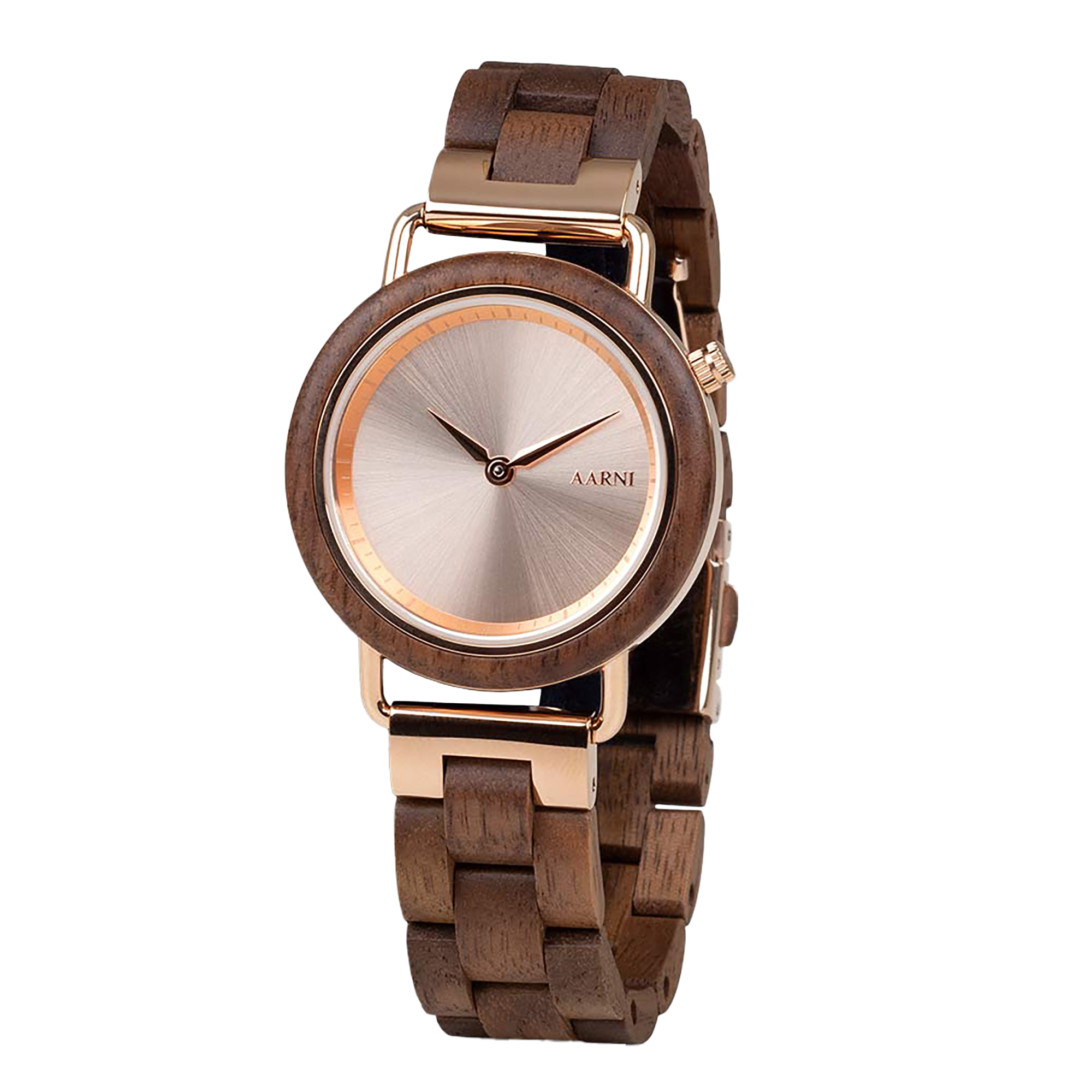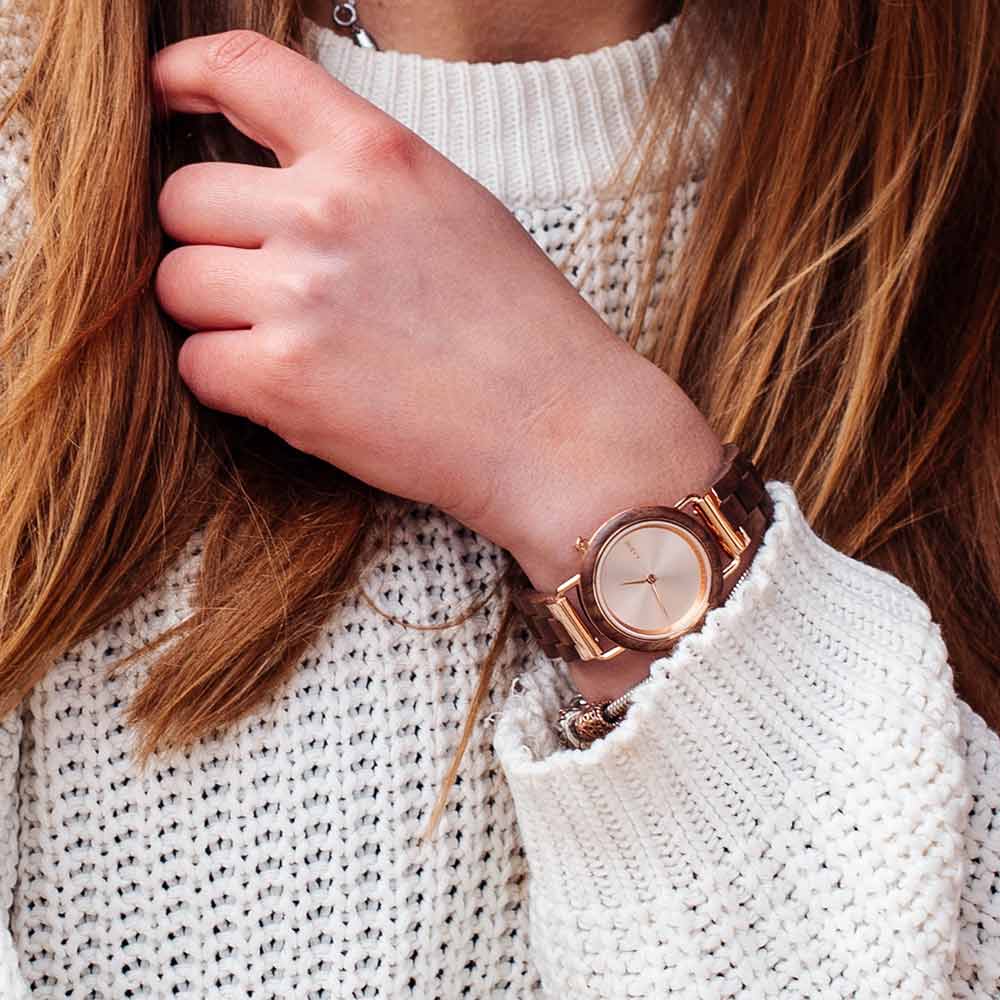 Petite Shine. Aarni Saga Walnut Wood Watch is a beautiful watch choice for women. Walnut is paired with the rose gold dial that catches your eye.