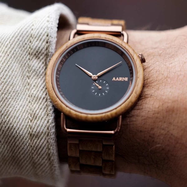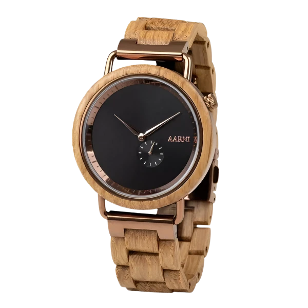 Unforgettable style. The minimalistic design of the Aarni Sirius Oak Wood Watch sets the bar high. Bronze details and a small second dial catch your eye.