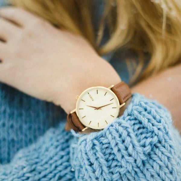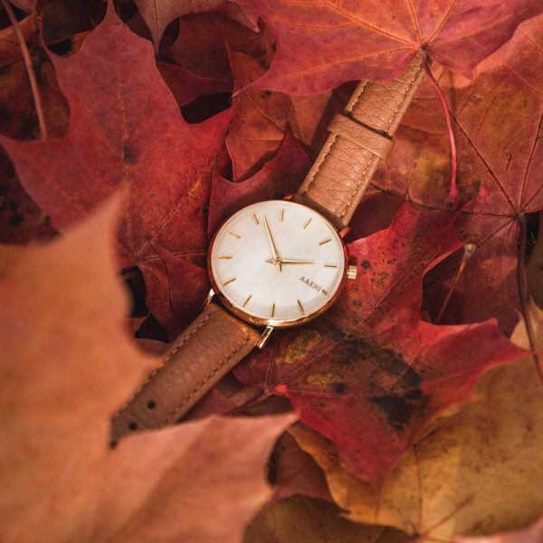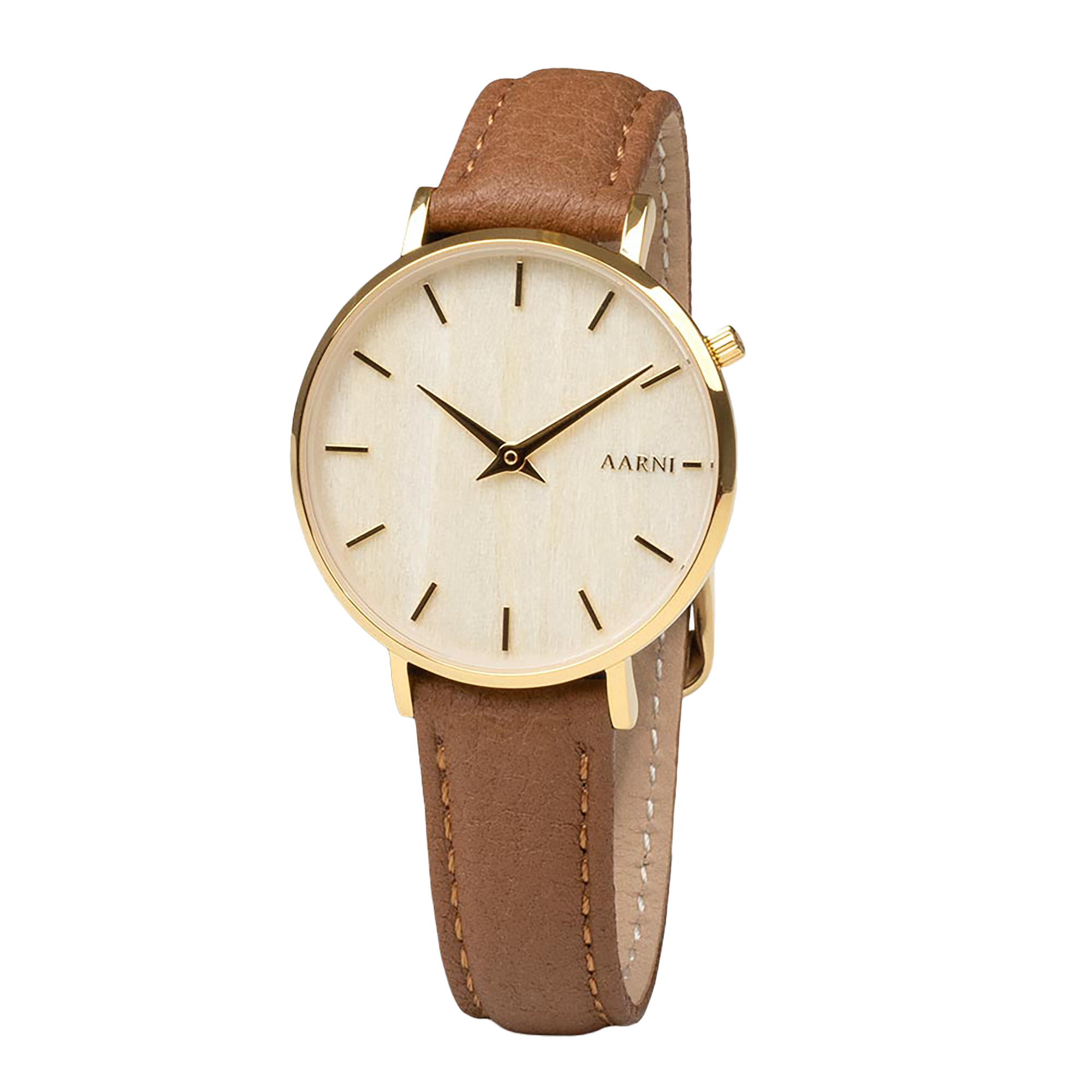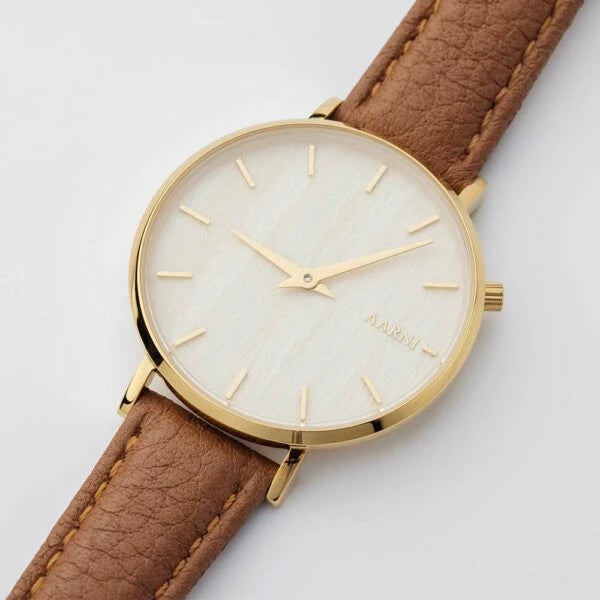 Classic design combined with the softness of elk leather. Aarni Taiga is designed to be particularly slim, making it feel incredibly light on your wrist. Golden details and a maple dial create a harmonious combination.